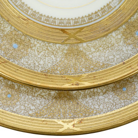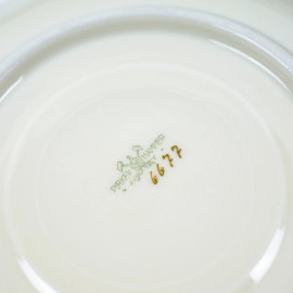 Servizio da thé in porcellana bianca con decori dorati, Pirken Hammer, prima metà XX secolo, composto da: 12 tazze con 12 sotto piattini e 12 piattini da dolce, diam. max cm 20,5.