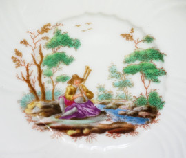 Servizio da thé, Richard Ginori, XX secolo, in porcellana bianca con decori policromi raffiguranti paesaggi con figure, composto da: 10 tazzine con 12 sotto piattini, 12 piattini da dolce, zuccheriera e spargizucchero (non pertinente), misure max cm 15x17.
