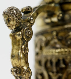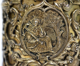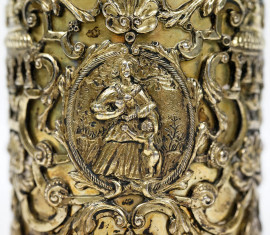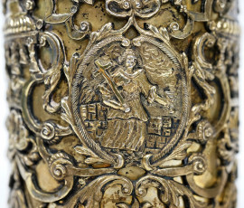 Singolare e raffinato boccale in argento vermeil riccamente sbalzato e lavorato, manifattura mittel-europea, XVII secolo, cm h 17x12, peso gr. 697, (mancante finale sul coperchio, lievi difetti)