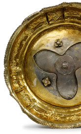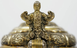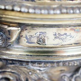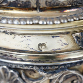 Coperchio incernierato e leggermente bombato a due registri sovrapposti di decori di nappe e motivi geometrici sbalzati e cesellati, due punzoni alla base del coperchio non identificati, uno dei due recante probabili lettere dell'argentiere. Presa laterale antropomorfa lavorata come un mezzobusto femminile sinuoso, terminante sulla sommità con busto di figura alata maschile stante e rivolta verso l'esterno.