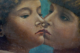Sorelle, olio su cartone ad assetto tondo, cm 48, prima metà del XX secolo, entro cornice, (difetti)