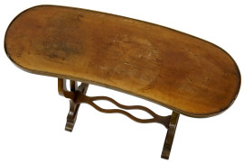 Tavolinetto con piano tipo fagiolo in legno impiallacciato, XX secolo, sostegni intagliati e sagomati riuniti da traversa, cm h 56,5x73x24, (difetti).