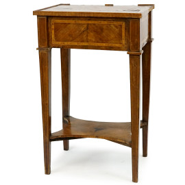 Tavolinetto impiallacciato, XIX secolo, piano decorato da medaglione intarsiato con cesta di fiori, fronte ad un cassetto, quattro gambe troncopiramidali riunite da pianetto sagomato, cm h 76x46,5x35, (difetti).