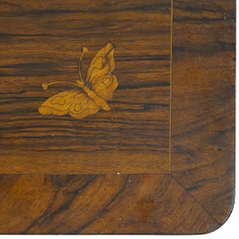 Tavolinetto rettangolare in vari legni, Inghilterra, XX secolo, piano intarsiato poggiante su montanti torniti riuniti da crociata, cm h 68x86x43, (difetti)