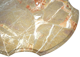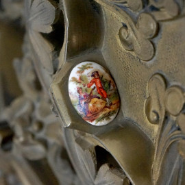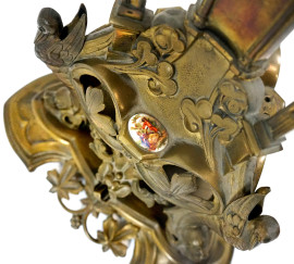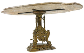Piano in marmo di linea sagomata poggiante su struttura in bronzo lavorata come architettura con creature alate e zoomorfe alla base, una piccola placchetta in porcellana policroma.