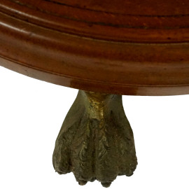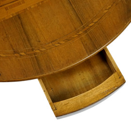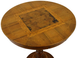 Tavolino tondo in noce, XIX secolo, piano filettato ed intarsiato, fusto tornito, poggiante su base circolare, cm h 75,5, diam.cm 75, (difetti)