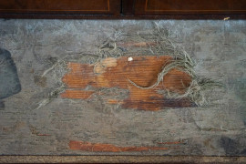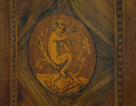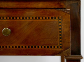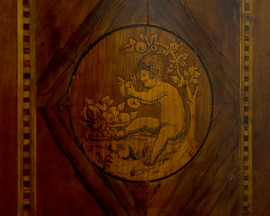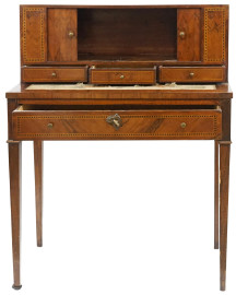 parte superiore con sportellini scorrevoli e tre cassettini, piano con inserto in stoffa, fronte ad un cassetto, quattro gambe troncopiramidali, fianchi decorati da medaglioni con puttini con frutti e cornucopia, (difetti).