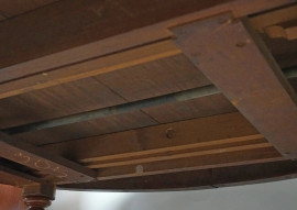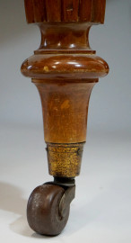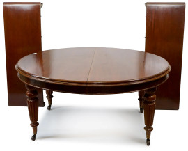 Tavolo tondo in mogano, Inghilterra, XIX secolo, piano circolare poggiante su quattro sostegni torniti completi di rotelle, diametro del piano cm 166
