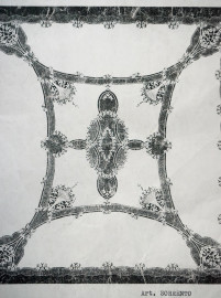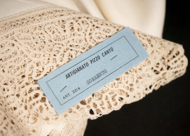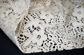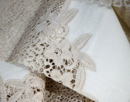 Tovaglia in puro lino e pizzo Cantù, finemente ricamata a mano, cm 250x270
