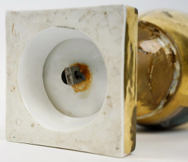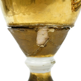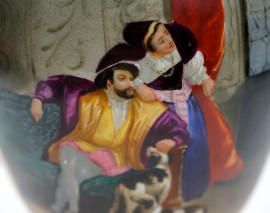 Vaso in porcellana policroma, Francia, XIX secolo, corpo dorato con riserva policroma raffigurante interno con coppia e levrieri, anse a foggia di cigno, base quadrata, cm h 32, (difetti, restauro).