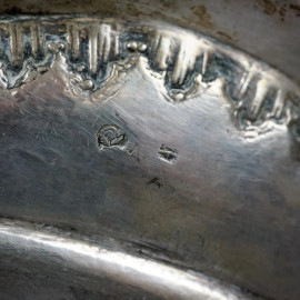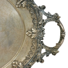 Vassoio in argento di linea ovale, corpo liscio, profili e prese laterali cesellati a volute e fiori, cm 50x30,5, punzoni San Marco, peso gr. 1200, (difetti)
