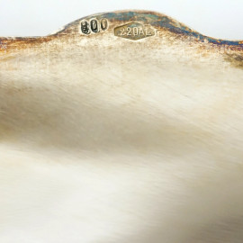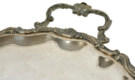 Vassoio ovale in argento, con due prese laterali e bordo cesellati a volute e conchiglie, cm 61,5x39,5, peso gr. 2020, (lievi difetti)