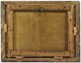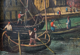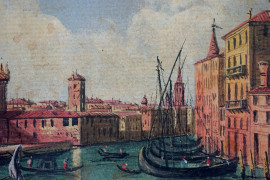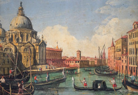 Vedutismo veneziano del XVIII secolo, Basilica di Santa Maria della Salute con gondolieri, tempera su carta riportata su tela, cm 14.5x18,5, entro cornice, (macchie)
