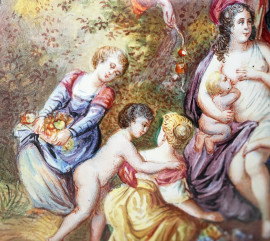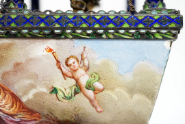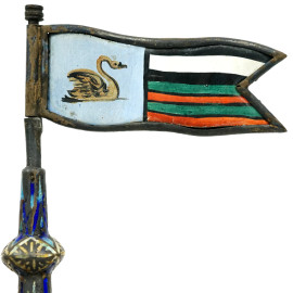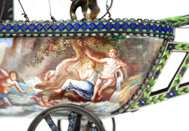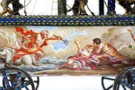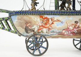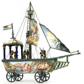 Modellato come veliero ad un solo albero con stendardo e vele spiegate, finemente dipinte su entrambi i lati con scene classiche e marine al retro. La vela a prua raffigura "Apollo e Dafne", mentre la vela centrale, più grande, illustra un episodio mitologico nel quale Minerva scaccia Marte.