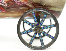 L'imbarcazione poggia su quattro ruote di carro, due delle quali presentano ripetuti punzoni della manifattura.
