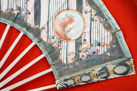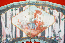 Ventaglio francese del XIX secolo, in carta dipinta a tre riserve con scena di corteggiamento centrale e paesaggi con figure, cm 27x50,5, entro teca, (difetti).
