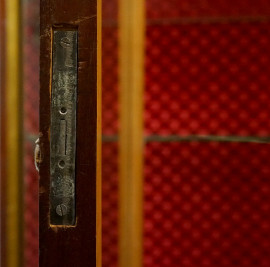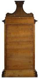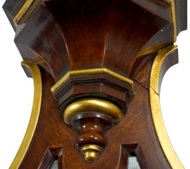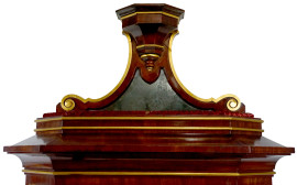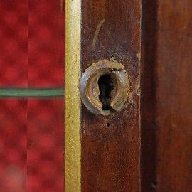 Vetrina scantonata in noce, XX secolo, cimasa intaglia con specchio, interno e particolari rivestiti in tappezzeria color borgogna, ingombro cm h 210x105x50, (difetti)