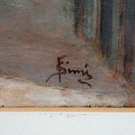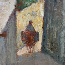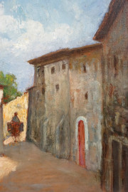 Vicolo con somarello, olio su tavola, cm 22x13, firmato, entro cornice.