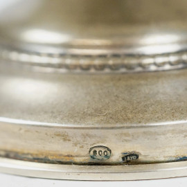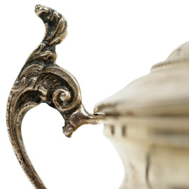 Zuccheriera in argento 800, corpo e coperchio baccellati, prese laterali a volute, cm h 14, peso gr. 160 circa
