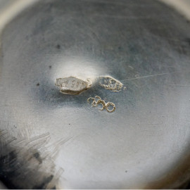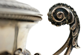 Zuccheriera in argento sbalzato e cesellato, prima metà del XX secolo, corpo baccellato, due manici laterali a volute cesellate, coperchio con presa a forma di frutto, cm h 13,5, peso gr.325