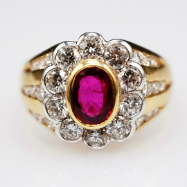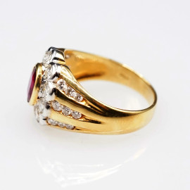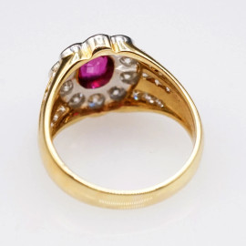 Anello in oro 18 KT con rubino centrale da 0,73 CT e diamanti da 1,39 CT, misura cm 13-14, peso lordo gr.6,1