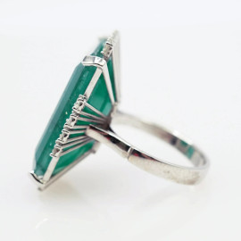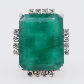 Anello in oro bianco 18 kt con smeraldo da 28.40 ct e brillantini da 0.80 ct complessivi, misura n.15, peso gr. 12