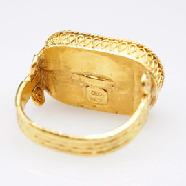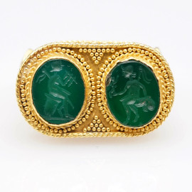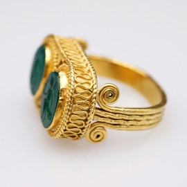 Anello in stile archeologico in oro 22 KT con paste vitree verdi incise di ispirazione classica. Decori in motivi a cordonetto e micro granulazione. Punzonato 916, misura 17-19, peso lordo gr. 14,3