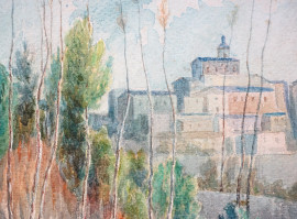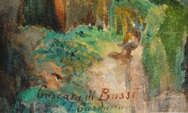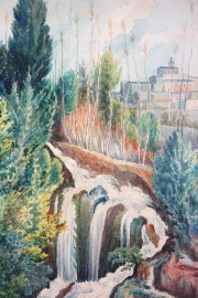 Cascata di Bussi, acquarello su carta, cm 44x27, firmato F.Giordano, (difetti)