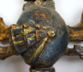 Due stemmi araldici in legno scolpito, laccato e dorato, fine XIX-inizi XX secolo, cm 33x27.