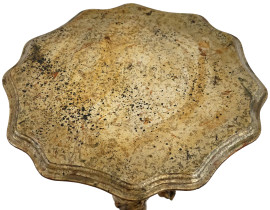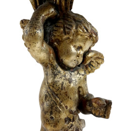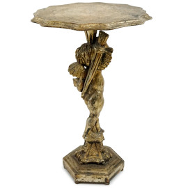Gueridon in legno scolpito e dorato, piano di linea sagomata sorretto da amorino, base esagonale, XX secolo, cm h 75, (difetti)