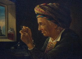Jan Moraczynski (1807-1870) attr.a, La cucitrice, olio su tavola, cm 30,5x22, entro cornice.