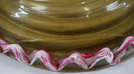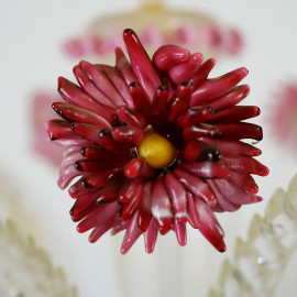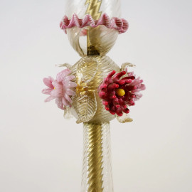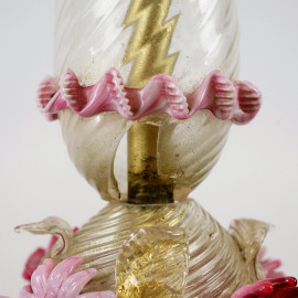 Lampada da terra in vetro di Murano ad otto luci, inclusioni a foglia d'oro ed applicazioni di fiori violacei, cm h 200x68, (difetti sulla base e sul fusto)