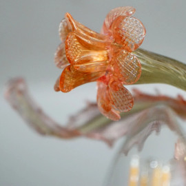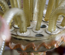Lampadario di Murano a sei luci, in vetro fumé e applicazioni floreali nei toni del rosa, XX secolo, cm 100 circa (compresa catena di attacco)