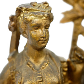 Orologio in metallo dorato raffigurante l'allegoria dell'agricoltura, fine XIX secolo, quadrante circolare a numeri romani, cm h 33x34x9, (difetti, meccanismo da revisionare).