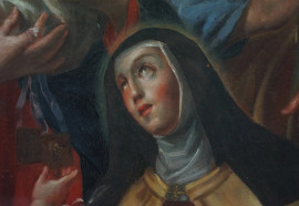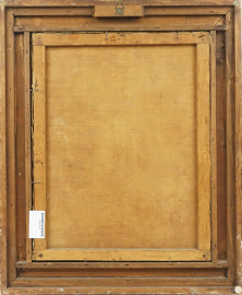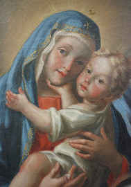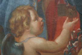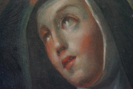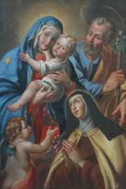 Pittore del XIX secolo, Sacra Famiglia con Santa Teresa, olio su tela, cm 47x36, entro cornice.