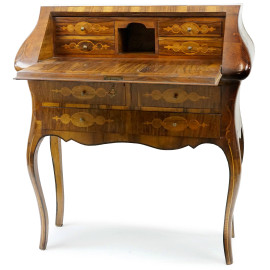 Ribalta in legno intarsiato, XX secolo, fronte con calatoia celante quattro cassettini e vano a giorno, tre cassetti sottostanti, quattro gambe mosse, cm h 104x93x38, (difetti).