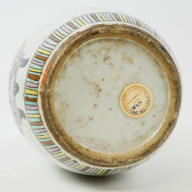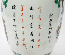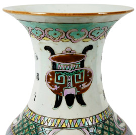 Vaso in porcellana policroma, corpo a balaustro con decori raffiguranti vasi e iscrizioni tutto intorno, Cina, XX secolo, cm h 43, (difetti)
