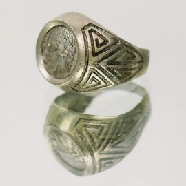 Anello in argento 900 con effigie raffigurante profilo di giovane atleta incastonato, peso gr.5,6, misura 15, (difetti)