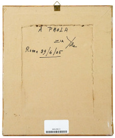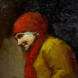 Anziana davanti al focolare, olio su cartone, cm 9,5x6, firmato, entro cornice
