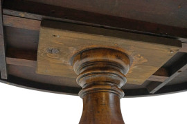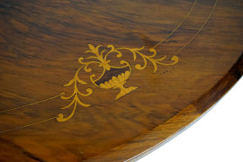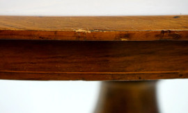 Basso tavolo di linea ovale in piuma di mogano con filetti ed intarsi in bosso, poggiante su montante a colonna e tre piedi sagomati, XIX secolo, cm h 76x116x87, (base non originale).