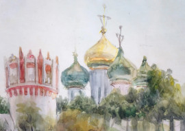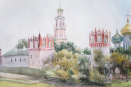 Il convento di Novodevichy a Mosca, acquarello su carta, cm 33x58 circa, XX secolo, entro cornice, (lievi difetti sulla carta).