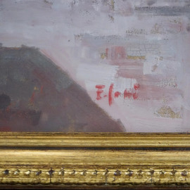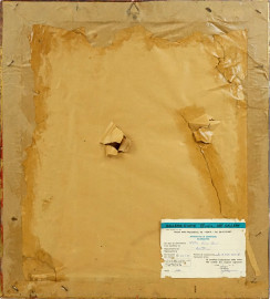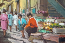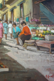 Scena di mercato, olio su masonite, cm 30x23 circa, firmato, entro cornice
