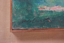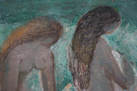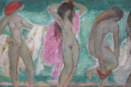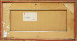 Bagnanti, olio su tavola, cm 25x65, firmato Casolaro, entro cornice.