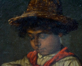 Bambino che sbuccia un arancio, olio su tela, cm 40,5x30,5, firmato Arturo Petrocelli, entro cornice, (difetti)