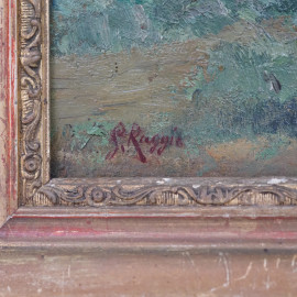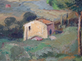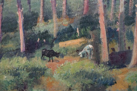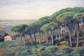 Bosco di pini a Castel Gandolfo, olio su cartone, cm 23x39, firmato , entro cornice.