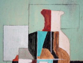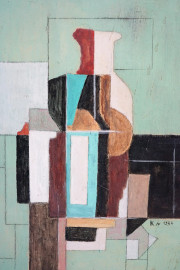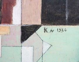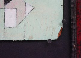 Composizione geometrica, tecnica mista su cartone, cm 29x23, siglato, entro cornice, (difetti)