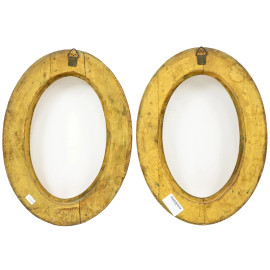 Coppia di cornici ad assetto ovale in legno dorato e laccato, XIX secolo, misure ingombro cm 47,5x35, misure battuta cm 35,5x23, (difetti)