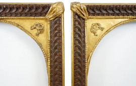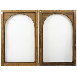Coppia di cornici in legno intagliato e parzialmente dorato, XIX secolo, passpartout centinato a mo' di arco con spagliazzi decorati a fiocchi, misure ingombro cm 125x84, misure battuta cm 111x70, (difetti)