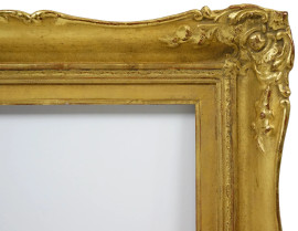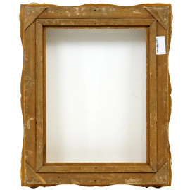 Cornice a guantiera in legno dorato, inizi XX secolo, fascia sagomata con fregi naturalistici e cespi fogliacei a rilievo negli angoli, misure ingombro cm 60x50, misure battuta cm 44x33,5, (difetti)
