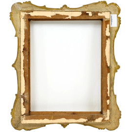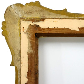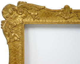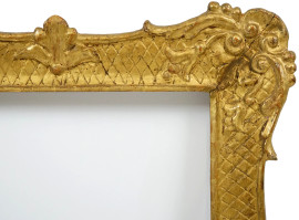 Cornice a guantiera, Napoli, XIX secolo, in legno intagliato e dorato, con bordo sagomato e battuta con decori angolari a conchiglie volute e fiori, fondo a graticcio inciso; misure ingombro cm 51x59, battuta cm 33,5x43,5